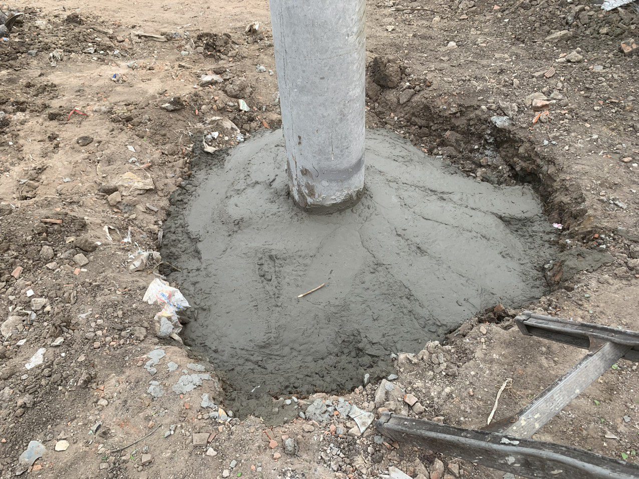 - Lấp đất đầm chặt, sau đó đổ bê tông giằng gốc trụ.